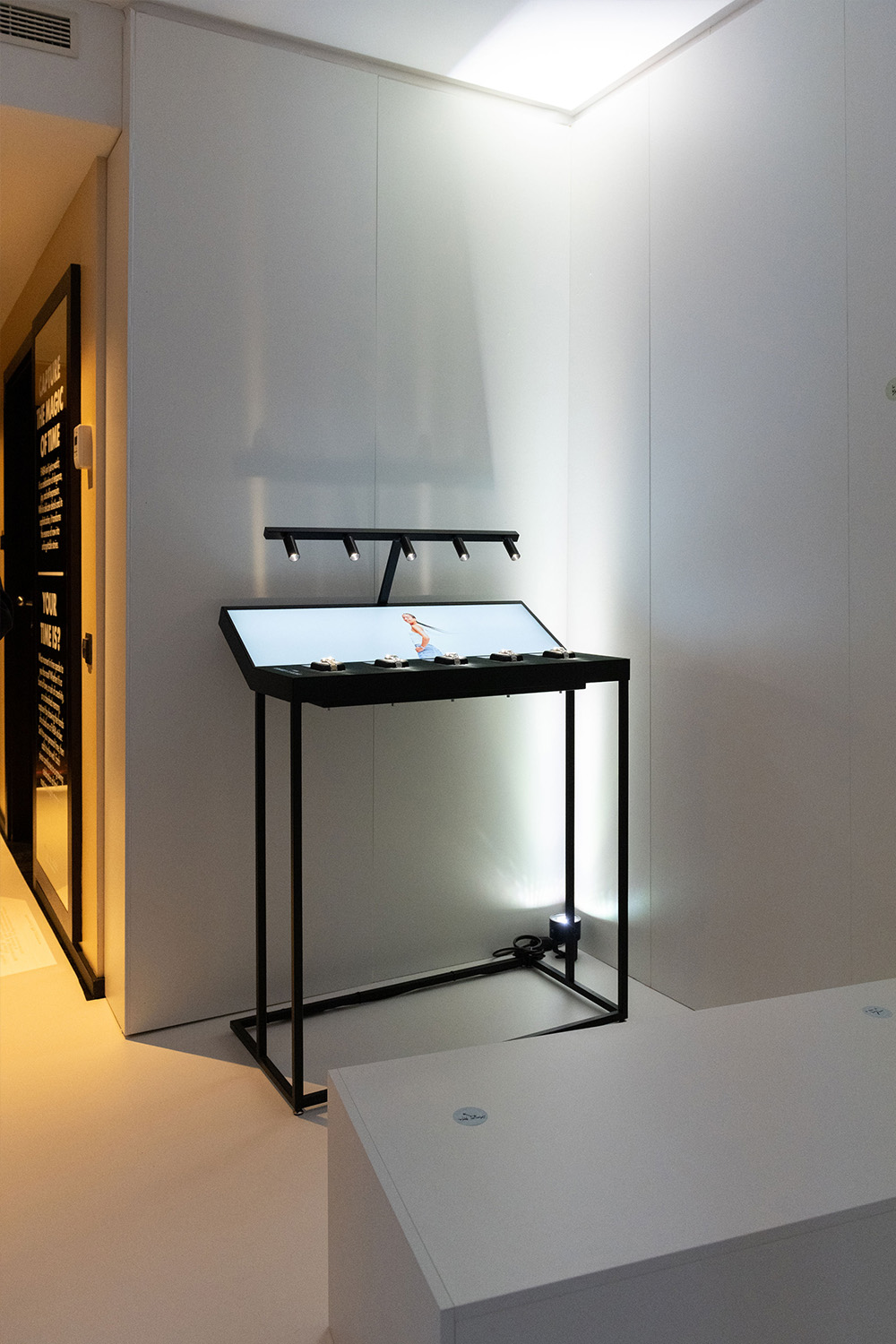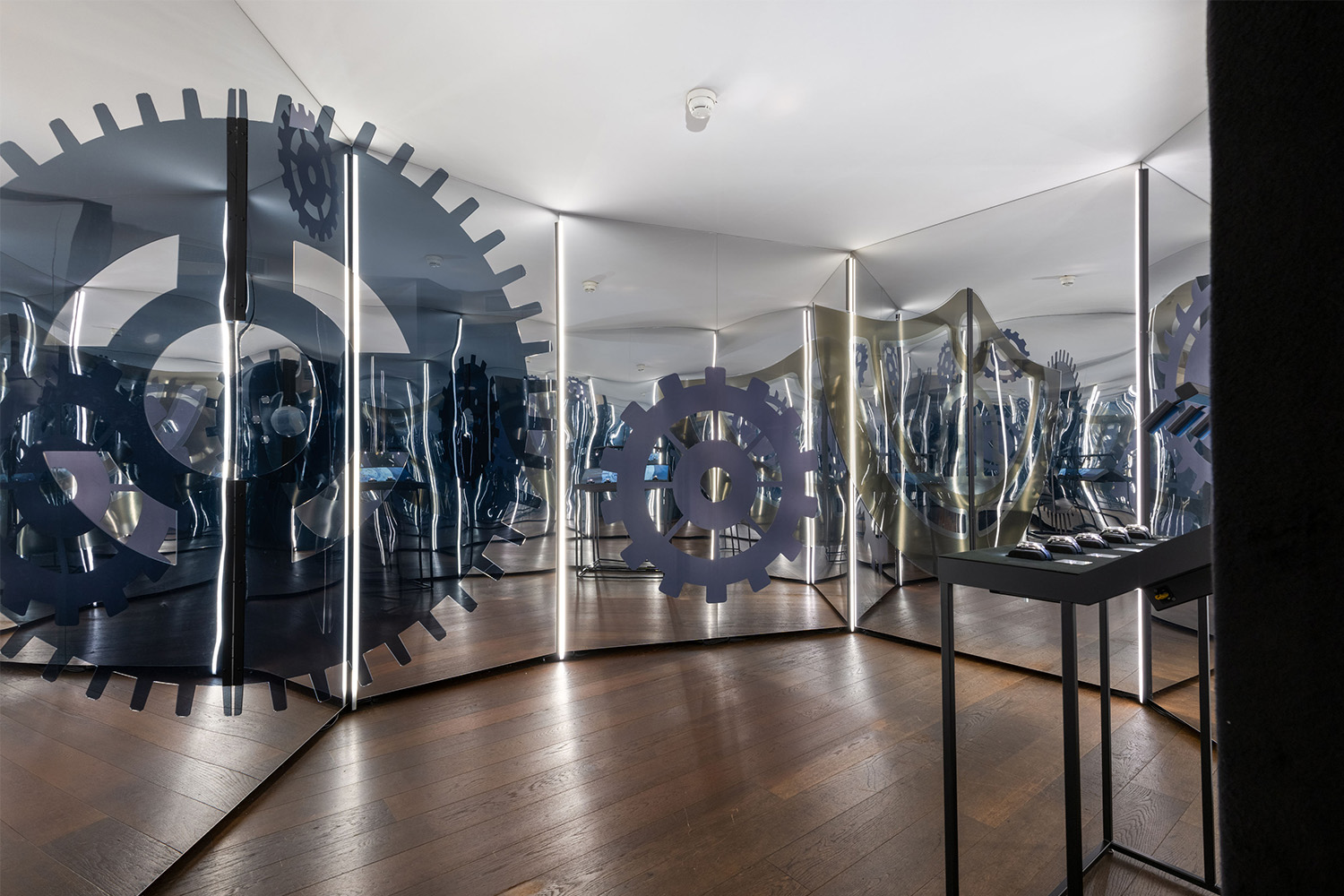 Die AIKON Kollektion präsentierte sich in einem verspiegelten Raum für alle, die sich trauen eine Ikone zu sein und nicht nur eine Uhr tragen, sondern Haltung zeigen. Auf dem verspiegelten Laufsteg zwischen Spiegelwänden, einer reflektierender Kugelinstallation und einem Neon-Logo konnten sich Besucher:innen auf dem Photospot selbst ins Rampenlicht stellen. Zusätzlich konnte die neue Kollektion am interaktiven Tisch entdeckt werden.