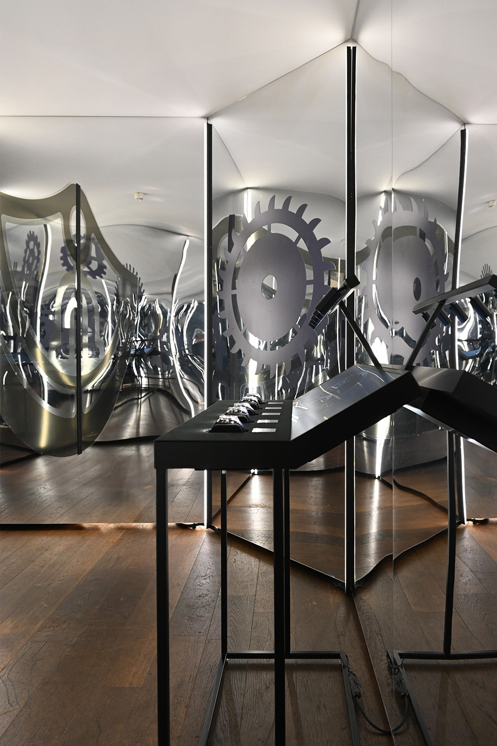 Der Raum für die MASTERPIECE Kollektion liess die Besucher:innen in einer immersiven Installation in das pulsierende Herz der Uhrmacher:innen-Kunst eintauchen. Ein begehbares Uhrwerk mit pulsierendem Licht, überdimensionalen Zahnrädern und hörbarem Herzschlag machte die Präzision und Leidenschaft traditioneller Uhrmacher:innen-Kunst nicht nur sichtbar, sondern auch spürbar.